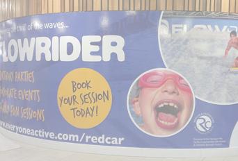 Flowrider. Self adhesive wall wrap, digitally printed & laminated for longevity. This was a temporary solution but has been in place for well over a year and still looks great.