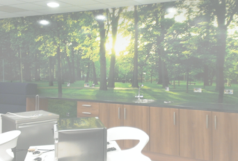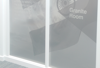 Designed by RDW Design Agency, this shows privacy film which still allows light into the room. This effect is created by applying a full colour digital print onto etch vinyl directly to the glass.